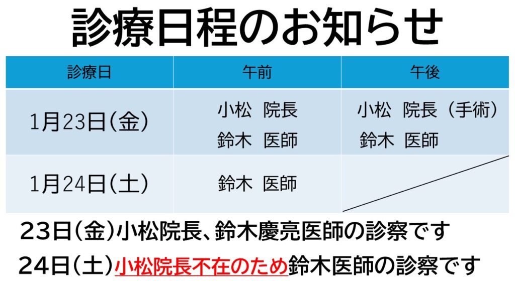 2026年1月23日(金) 、24日(土)診療日程のお知らせ 2025.12.23 2026年1月23日(金)、24日(土) 小松院長と鈴木慶亮医師の診察となります。 24日(土) 小松院長不在のため鈴木医師の診察となります。 ご理解のほどお願い致します。 前へ 次へ