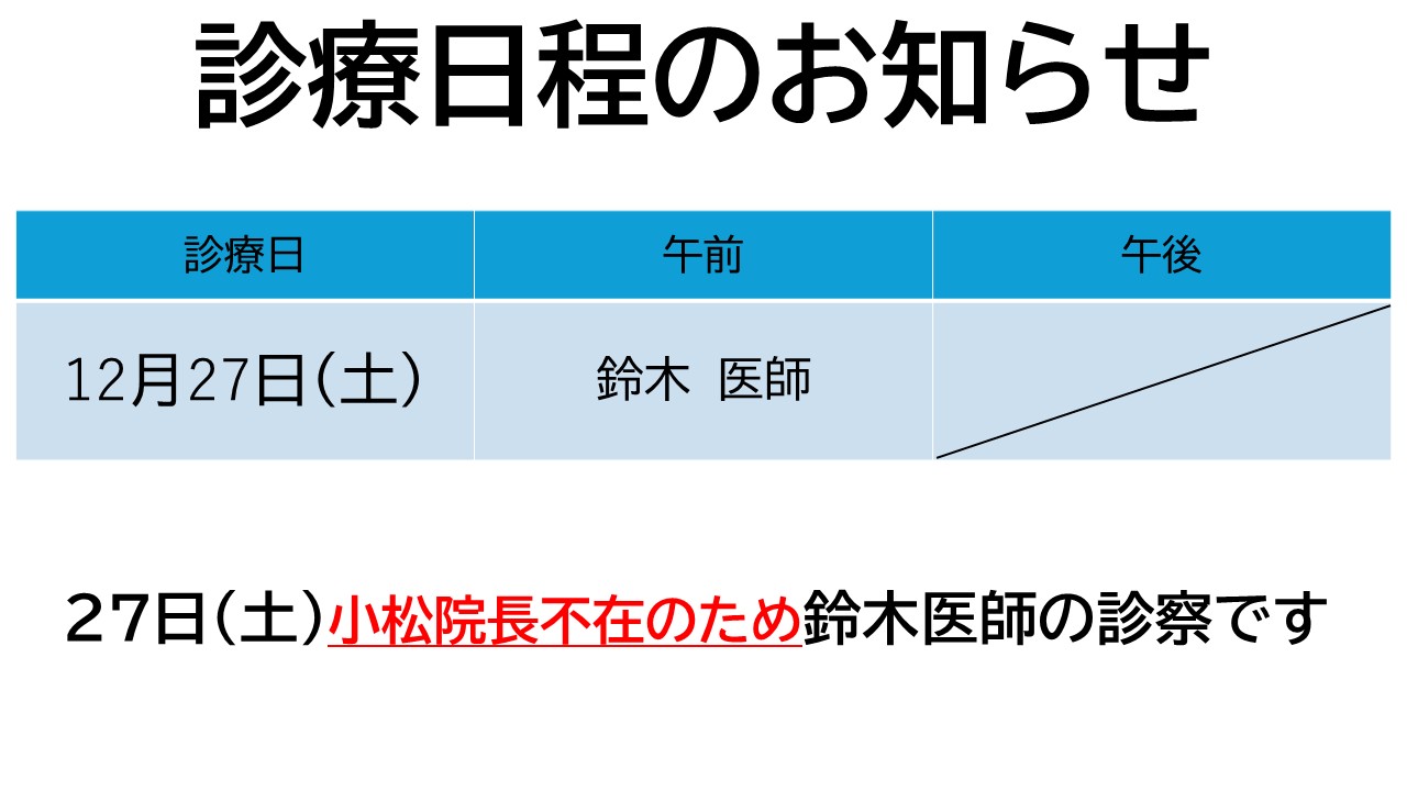 2025年12月27日(土) 小松院長不在のため鈴木慶亮医師の診察となります。